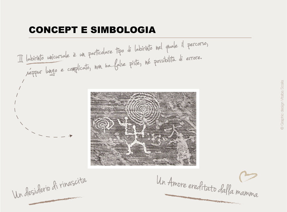 Da un lato il pittogramma, ovvero il labirinto unicursale, simboleggia il percorso, che seppur lungo e complicato, non ha false piste né possibilità di errore.